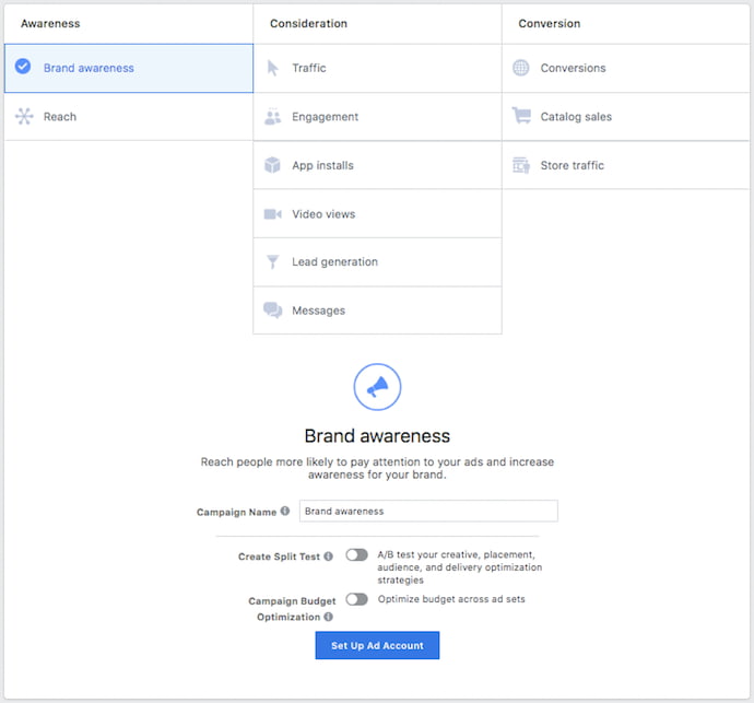 Facebook's Ads Manager, like many social media advertising networks, is designed with your campaign objective in mind. Before getting started, Ads Manager will prompt you to choose an objective for your campaign: