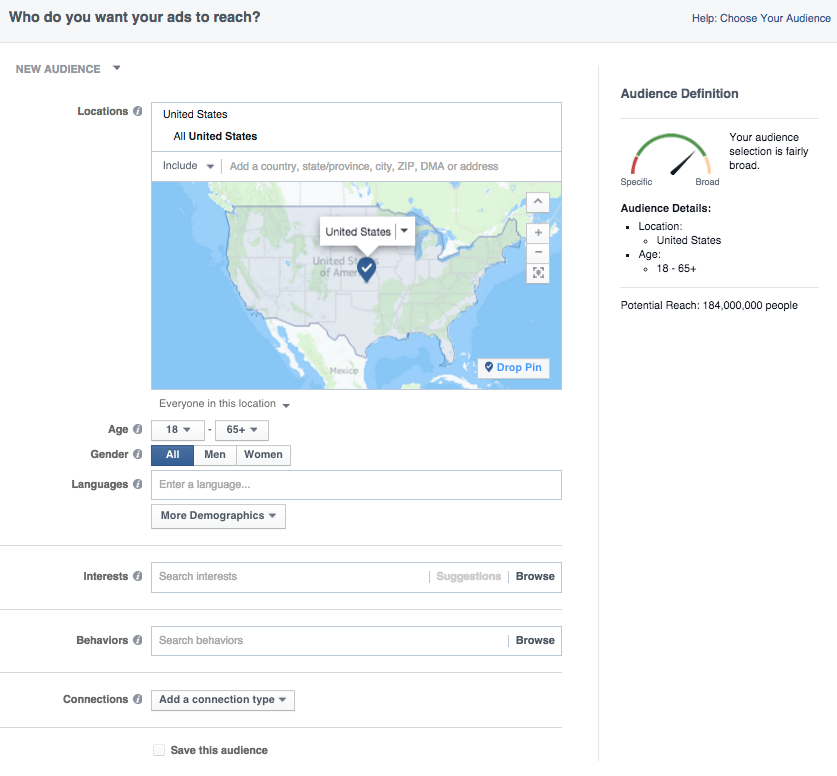 If you're wavering between choosing a specific audience over a broad one, consider your objective. If you're looking to drive traffic, you'll probably want to focus on the type of people you know will be interested in your offering. However, if you're looking to build brand awareness or promote a widely appealing offer, feel free to focus on a more general audience.